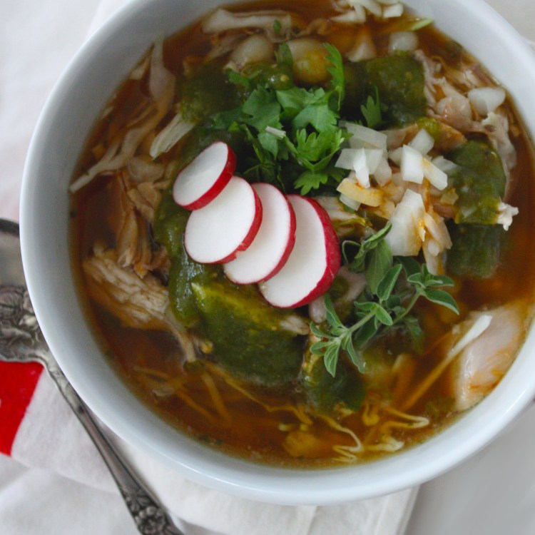 This is a chicken pozole with two different sauces to add. Mix in the dry chile salsa if you want Pozole Rojo and mix in the tomatillo salsa if you want Pozole Verde. To save time you can use cooked chicken and premade stock but it won’t be as tasty. Luckily this makes a big batch because it’s even better the second day!